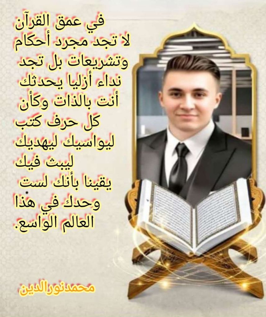 في كل صباح تشرق فيه الشمس، أعلم أن شمس القرآن أسبق، نورها لا يخفت، دفؤها لا يغيب، وقربها لا ينأى. اقرأه ليكون لك شفيعا، عش معه ليكون لك سكنا، وأحمله في قلبك ليكون لك دليلا في دروب لا يعرفها إلا العارفون.